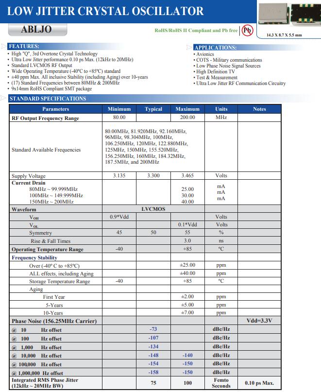 ABRACON旗艦ABLNO系列提供超低相位噪聲固定時鐘或電壓控制晶體振蕩器(VCXO)解決方案標(biāo)準(zhǔn)尺寸為9x14mm。同超過12 kHz的37fs典型RMS抖動20MHz帶寬@ 100MHz載波,ABLNO是性能驅(qū)動的理想選擇通訊,射頻,無線回程,和儀器應(yīng)用。