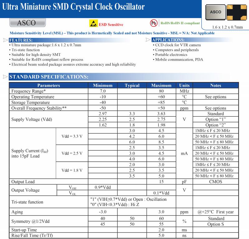 | ABRACON晶振 | 標(biāo)示 | ASCO系列晶振 | 晶振基本信息對(duì)照表 |