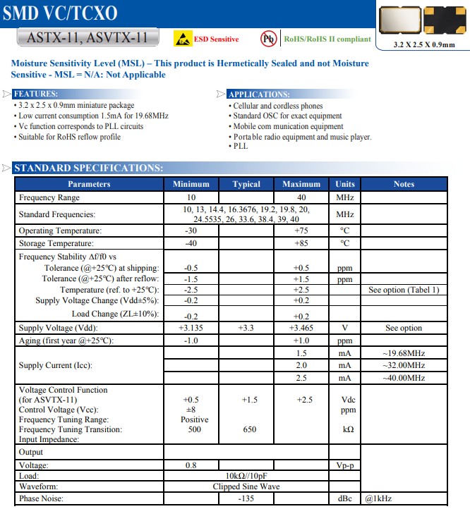 2.、頻率穩(wěn)定度:關(guān)鍵參數(shù),高端晶振可以達到10-9級別。 指在規(guī)定的工作溫度范圍內(nèi),與標稱頻率允許的偏差,用PPm(百萬分之一)表示。一般來說,穩(wěn)定度越高或溫度范圍越寬,價格越高。對于頻率穩(wěn)定度要求±20ppm或以上的應用,可使用普通無補償?shù)?a href="http://ank13.com/jkjz/SG3225HBN.html" target="_blank" title="晶體振蕩器">晶體振蕩器。對于介于±1 至±20ppm 的穩(wěn)定度,應該考慮溫補晶振TCXO 。對于低于±1ppm 的穩(wěn)定度,應該考慮恒溫晶振OCXO。進口艾博康晶振,ASTX-H11系列晶振,ASTX-H11-24.576MHZ-T晶振