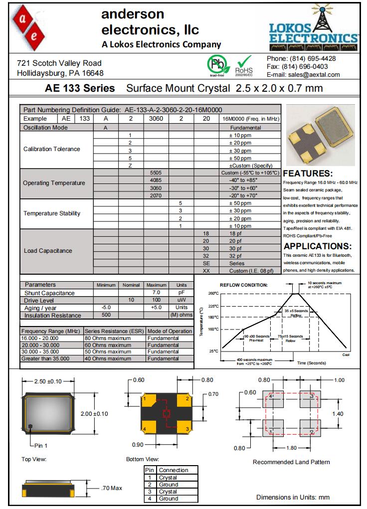 安德森晶振|AE-133-A-2-3060-2-30-16M0000|6G通信設(shè)備晶振,安德森晶振,AE-133進(jìn)口晶振,無源晶振,AE-133-A-2-3060-2-30-16M0000晶振,石英貼片晶振,晶體諧振器,SMD晶振,2520mm晶振,四腳貼片晶振,頻率16MHz,負(fù)載30pF,工作溫度-30~60°C,頻率容差20pm,超小型晶振,低成本晶振,無鉛環(huán)保晶振,6G通信設(shè)備晶振,移動(dòng)電話晶振,藍(lán)牙音響晶振,高密度應(yīng)用晶振.
