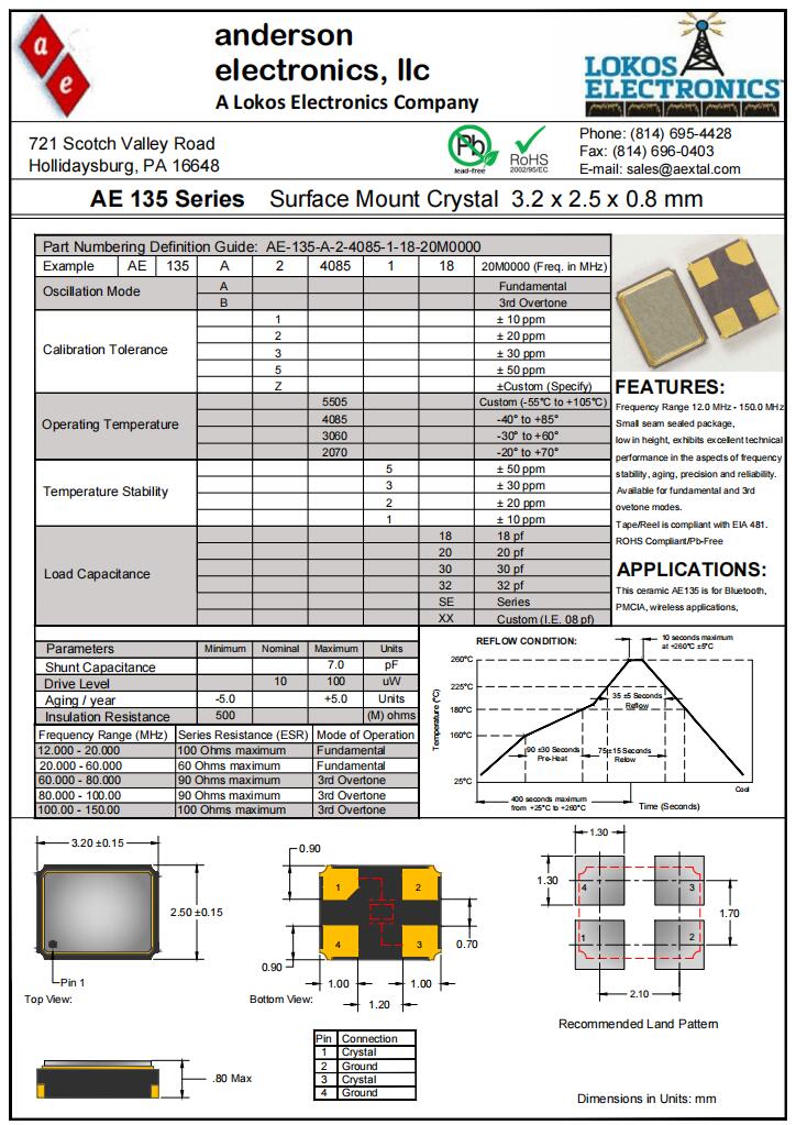 美國(guó)安德森晶振|AE-135-A-1-4085-2-20-18M4320|3225mm晶振,美國(guó)安德森晶振,AE135石英晶振,進(jìn)口晶振,AE-135-A-1-4085-2-20-18M4320晶振,無(wú)源晶振,晶體諧振器,四腳貼片晶振,3225mm晶振,頻率18.432MHz,負(fù)載20pF,工作溫度-40~85°C,頻率容差10pm,小體積晶振,高精度晶振,高可靠性晶振,PMCIA晶振,無(wú)線應(yīng)用晶振,藍(lán)牙耳機(jī)晶振,筆記本電腦晶振.