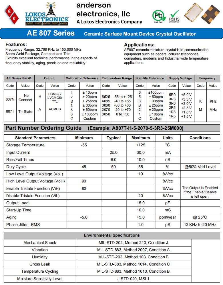 Anderson晶振|AE807T-H-2-4085-3-3R3-25M000|5032mm晶振,Anderson晶振,AE807進口晶振,有源晶振,AE807T-H-2-4085-3-3R3-25M000晶振,石英晶體振蕩器,5032mm晶振,四腳貼片晶振,SMD晶振,頻率25MHz,電壓3.3V,工作溫度-40~85°C,頻率容差20pm,緊湊薄晶振,低老化晶振,高可靠性晶振,蜂窩電話晶振,計算機應(yīng)用晶振,調(diào)制解調(diào)器晶振,工業(yè)自動化晶振.