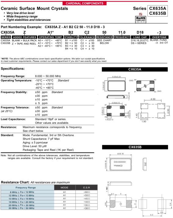 更多>>Cardinal卡迪納爾晶振,CX635A無(wú)源四腳晶振,CX635AZ-A2B3C350-11.0D18-3晶振