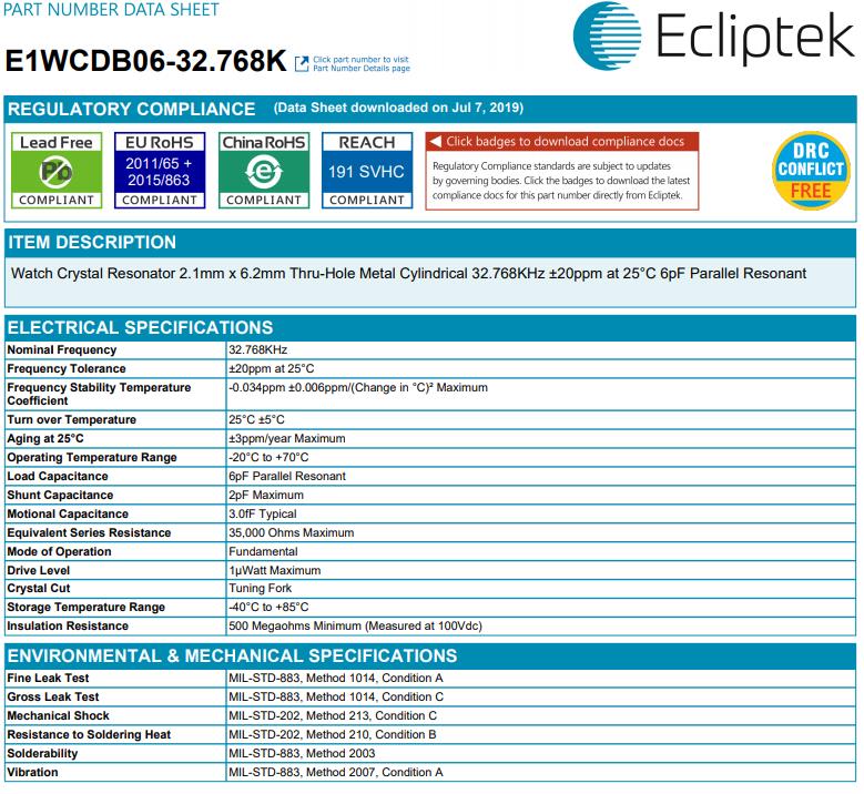 日蝕晶振E1WC,E1WCDB06-32.768K石英插件晶振, Ecliptek晶振,歐美晶振,石英晶體,音叉晶體,無(wú)源晶振,圓柱晶振,32.768K晶振型號(hào)E1WC,E1WCDB06-32.768K是一款圓柱型金屬面的插件晶振,尺寸為2060mm,頻率32.768KHZ,精度20ppm,負(fù)載電容10pF,工作溫度-20~+70°C.具備高性能的特點(diǎn),比較適合用于兒童玩具,錄音筆等領(lǐng)域.