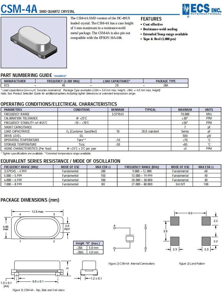 ECS-240-12-28A-TR,CSM-4A,24MHz,ECS無源晶振,車載晶振,美國(guó)進(jìn)口晶振,伊西斯晶振,ECS晶振,型號(hào):CSM-4A,編碼為:ECS-240-12-28A-TR,頻率:24.000MHz,工作溫度范圍:-10℃至+70℃,小體積尺寸:12.5x4.85mm橢圓形SMD封裝,四腳貼片晶振,無源晶振,石英晶振,石英晶體諧振器,SMD晶振。CSM-4A SMD版本的HC-49US含鉛晶體,CSM-4A在電阻焊金屬封裝中的外殼高度最大為5mm。CSM-4A也被確定與EPSON MA-506兼容。適用于:移動(dòng)通訊設(shè)備,無線網(wǎng)絡(luò)晶振,藍(lán)牙模塊晶振,車載晶振,數(shù)碼電子晶振,物聯(lián)網(wǎng)等應(yīng)用。