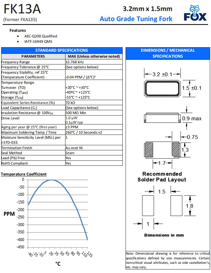 FK13AEIWI0.032768-T3,3215mm,FOX兩腳貼片晶振,鐘表電子晶振,規(guī)格表