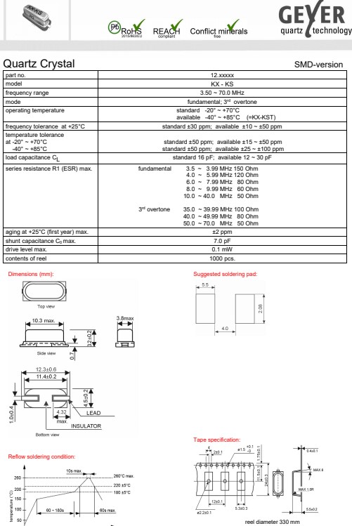 GEYER晶振,KX-KS低損耗晶振,無源貼片晶振,普通貼片石英晶振外觀使用金屬材料封裝的,具有高穩(wěn)定性,高可靠性的石英晶體振蕩器,晶振外觀本身使用金屬封裝,充分的密封性能,可確保其高可靠性,采用編帶包裝,外包裝采用朔膠盤,可在自動貼片機上對應(yīng)自動貼裝等優(yōu)勢.