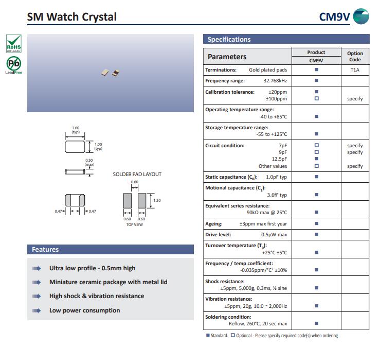 高利奇晶振,CM9V-T1A晶振,32.768K系列晶振此款SMD晶體并且可以承受回流焊接的高溫,波峰焊接,回流焊接等,貼片表晶主要特點是該產(chǎn)品排帶包裝,焊接模式主要使用SMT焊接,給現(xiàn)代SMT工藝帶來高速的工作效率,32.768K系列產(chǎn)品本身具有體積小,厚度薄,重量輕等特點,此音叉型石英晶體諧振器,晶振產(chǎn)品本身具備優(yōu)良的耐熱性,耐環(huán)境特性,在辦公自動化,家電領(lǐng)域,移動通信領(lǐng)域可發(fā)揮優(yōu)良的電氣特性,符合無鉛標(biāo)準(zhǔn),滿足無鉛焊接的回流溫度曲線要求,金屬外殼的石英晶振使得產(chǎn)品在封裝時能發(fā)揮比陶瓷晶振外殼更好的耐沖擊性能.
