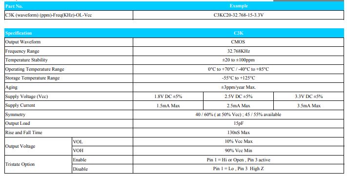 | C3K (waveform) (ppm)-Freq(KHz)-OL-Vcc | C3KC20-32.768-15-3.3V |