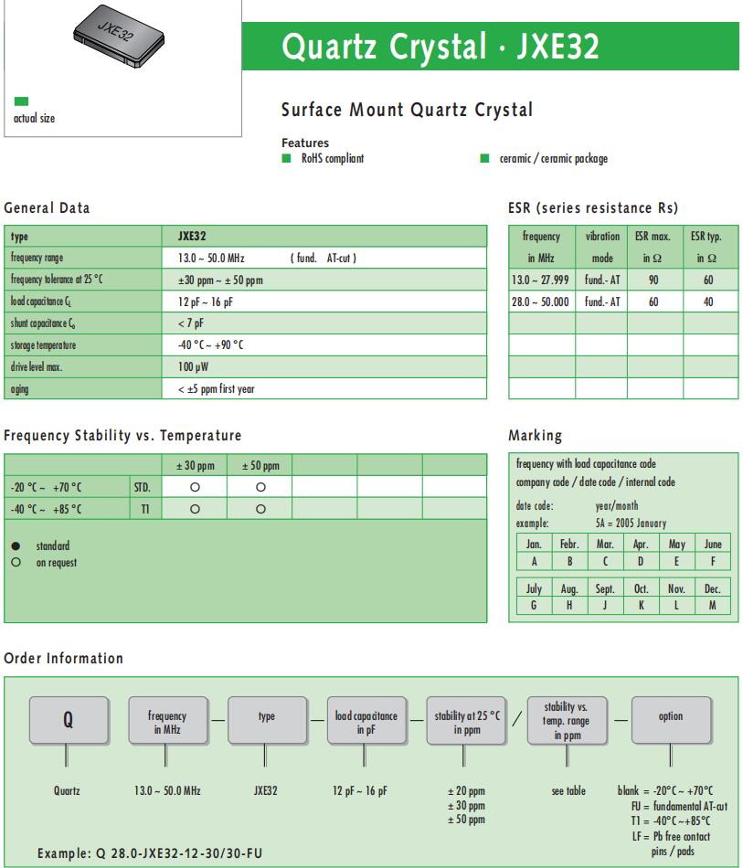 | Q 20.0-JXS22-12-10/10-FU-WA-LF | Jauch晶振 | JXS22-WA | 20MHz | ±10ppm | 12pF | -20°C ~ 70°C |
