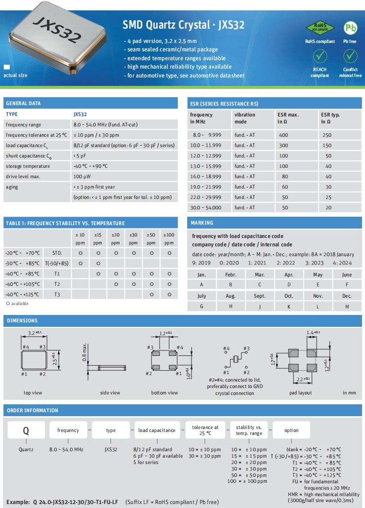| Q 24.0-JXS22-8-10/10-FU-WA-LF | Jauch晶振 | JXS22-WA | 24MHz | ±10ppm | 8pF | -20°C ~ 70°C |