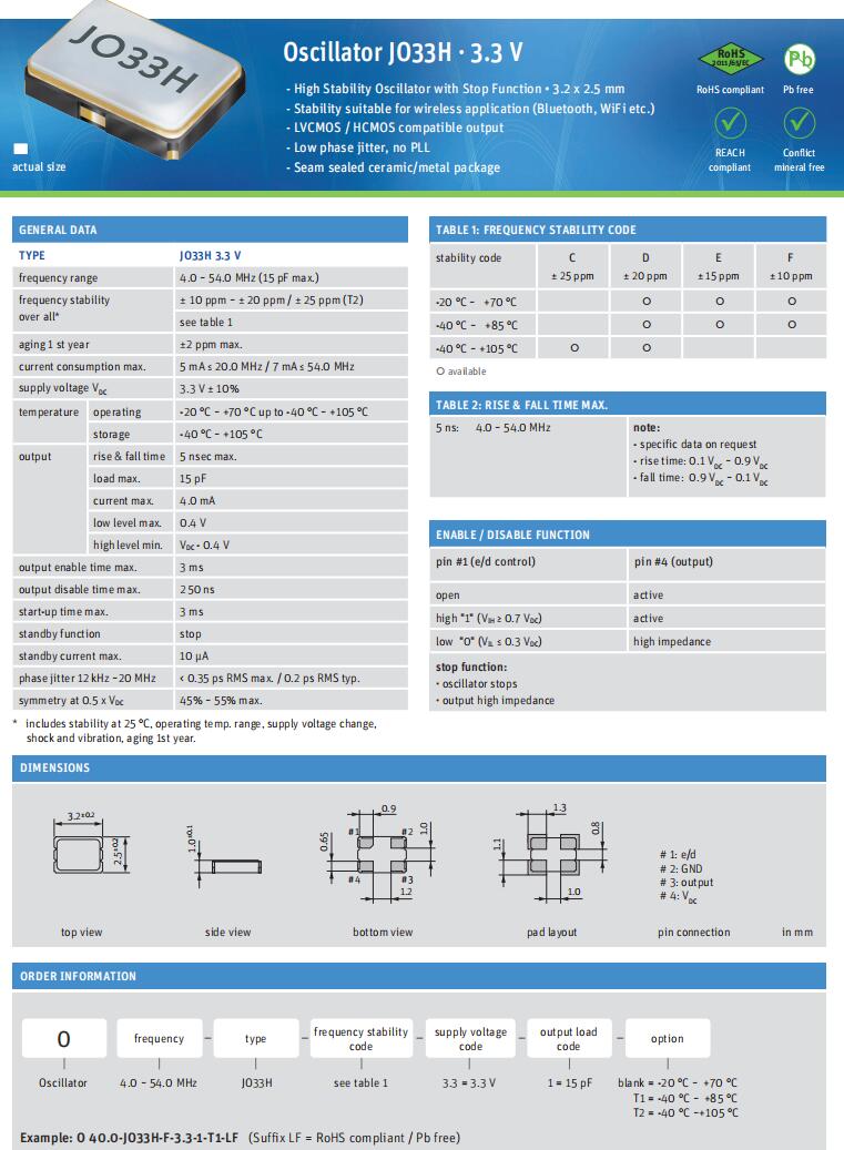 O 18.0-JO33H-D-3.3-1-T2-LF,Jauch歐美品牌,6G無線模塊晶振規(guī)格表
