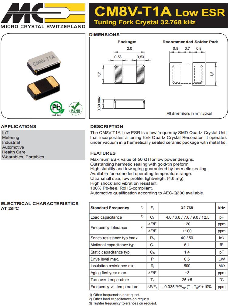 CM8V-T1A-Low ESR-32.768kHz-12.5pF-20ppm-TA-QC|MICRO CRYSTAL特點(diǎn):