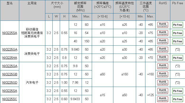 | 頻率公差 | Max. ±10 ×10-6 | Max. ±20×10-6 | Max. ±50 ×10-6 | |