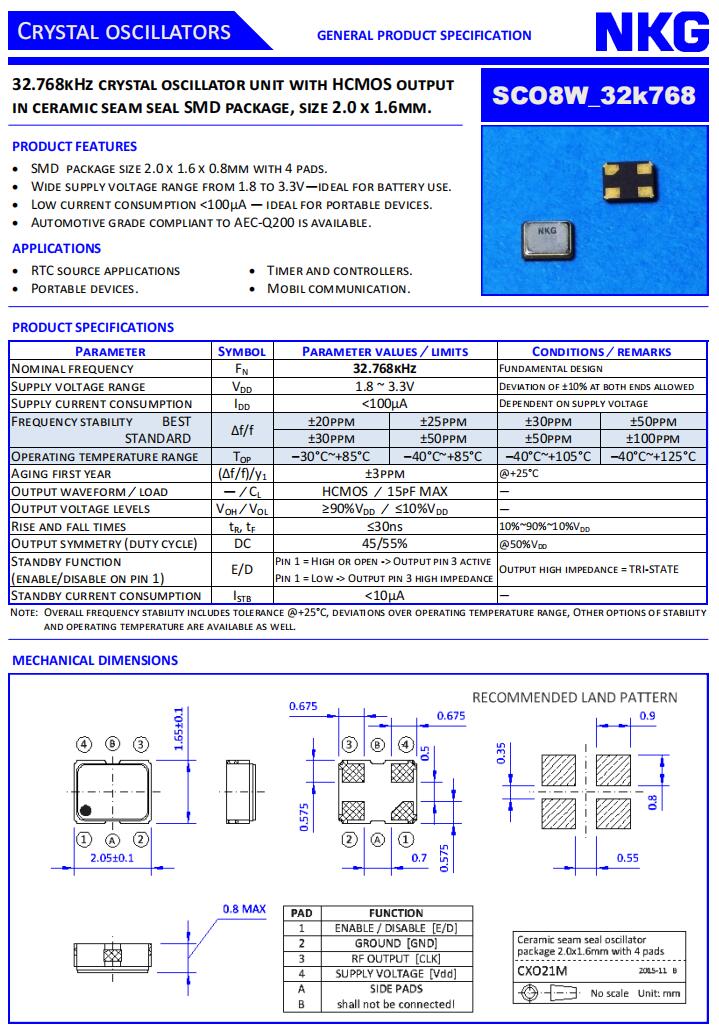 NKG Crystal|SCO8W-32K768-WTS-EXT|2016有源晶振特點