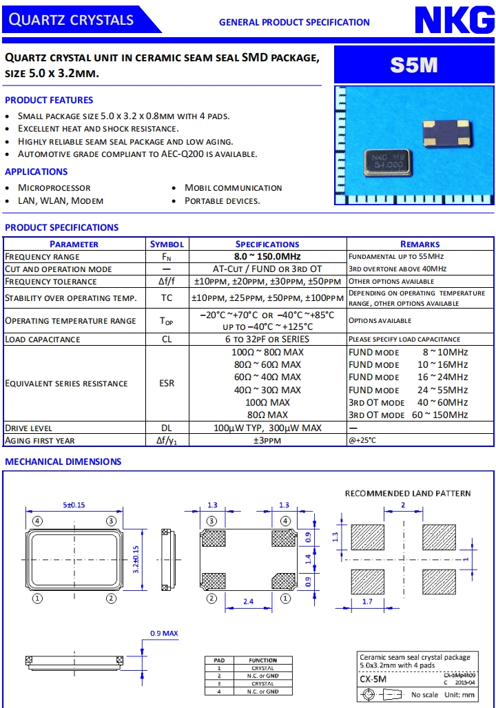 香港NKG晶體|S5M12.288F10M23-EXT|6G無線局域網晶振規(guī)格表