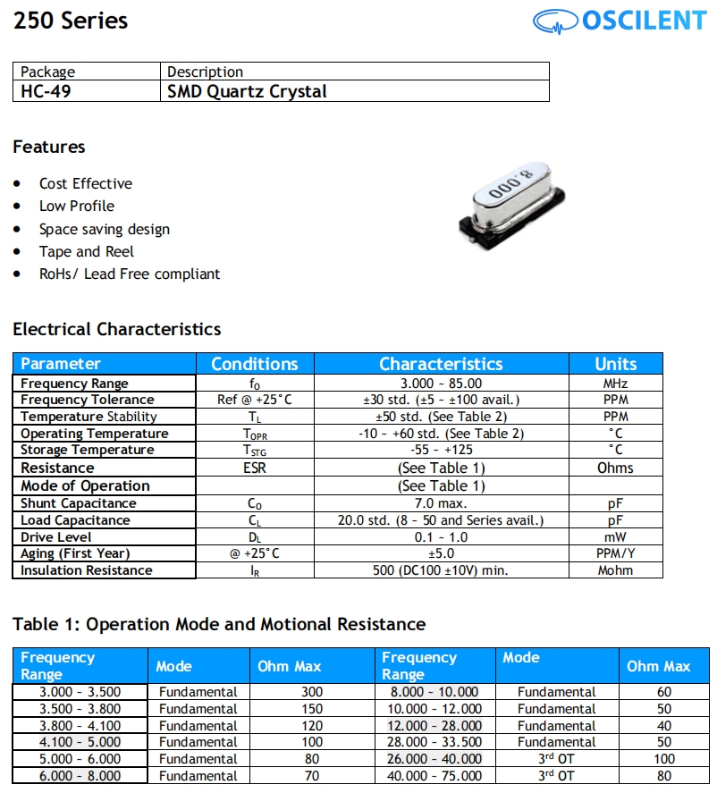 OSCILENT晶振,250-14.7456M-20-05KS-TR,6G無線局域網(wǎng)晶振規(guī)格表