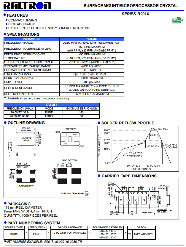 | R2016-48.000-18-F-1010-TR | R2016 | 48.000MHz | 2.0 x 1.6mm | ± 10 ppm | ± 10 ppm | 18 pF | -10°C~+60°C |