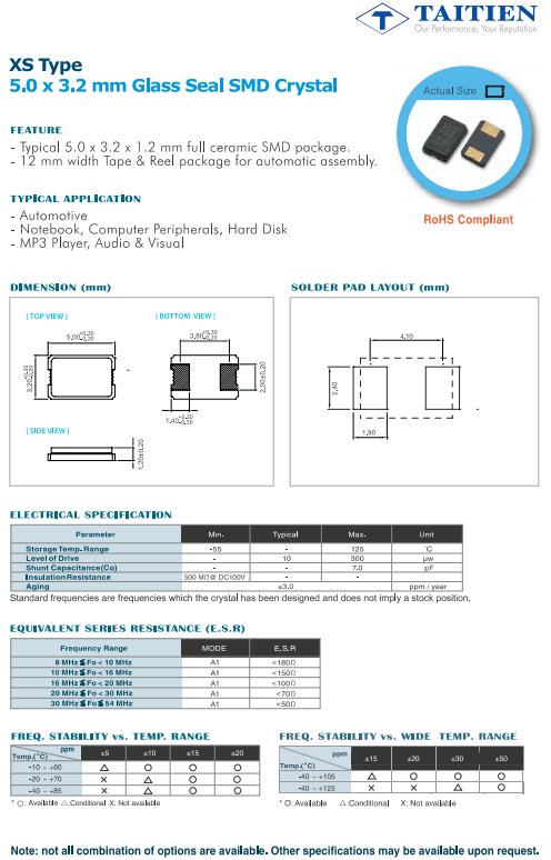 | XSGCECNANF-8.000000 | TAITIEN晶振 | XS | 8MHz | ±30ppm | ±20ppm | 18pF |