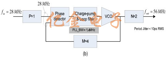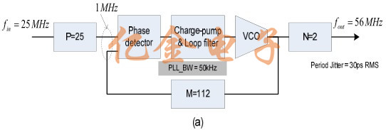 設(shè)計(jì)a需要較大的P值,從而產(chǎn)生一個(gè)帶寬為50kHz(由公式3計(jì)算)并且抖動(dòng)為30ps,這超出了規(guī)范.設(shè)計(jì)b利用頻率程序-能夠選擇允許的輸入頻率預(yù)分頻比為1,產(chǎn)生PLL帶寬為1.4MHz.抖動(dòng)小于10ps rms,符合規(guī)定的要求.