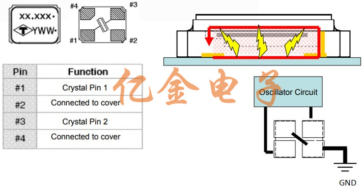 消除由EMI引起的EMI信號(hào)波形 降低水晶的EMI在振蕩器電路中TAITIEN晶體單元上的端子2和4是電氣的連接到水晶的金屬蓋.建議將端子2和4連接到GND最小化EMI.