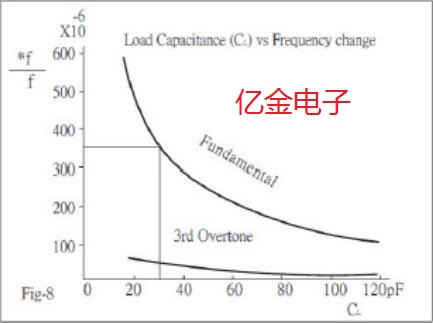圖8顯示了極品諧振器和第三泛音諧振器的負(fù)載電容與頻率變化率的特性.如圖-8所示,為了通過改變負(fù)載電容得到寬頻范圍內(nèi)的變化量,需要使用一個(gè)基頻諧振器并選擇一個(gè)較小的負(fù)載電容.