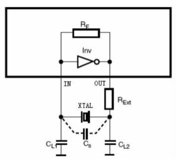 XTAL是無源晶振,相當于三點式里面的電感,CL1和CL2就是電容,Inv非門和R1實現(xiàn)一個NPN的三極管。若無源晶振負載CL=20PF,一般情況下,我們選擇電容CL1=CL2=27PF~33PF。 選錯外接電容可能會造成無源晶振不起振、起振困難或工作不穩(wěn)定。Inv需要一個電阻,不然它處于飽和截止區(qū),而不是放大區(qū),RF相當于三極管的偏置作用,讓Inv處于放大區(qū)域,那么Inv就是一個反相器,這個就實現(xiàn)了NPN三極管的作用,NPN三極管在共發(fā)射極接法時也是一個反相器。