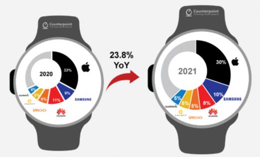 與智能手機市場的下滑情況類似,華為在智能手表市場的表現(xiàn)較2020年有所下滑,但在全球市場仍排名第三。