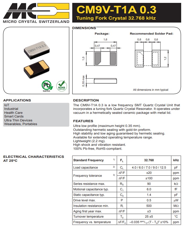 | Micro Crystal | CM9V-T1A-32.768kHz-7pF-20PPM-TA-QC | 32.768 kHz 7.0 pF +/-20 PPM -40/+85C | 32.768 kHz |