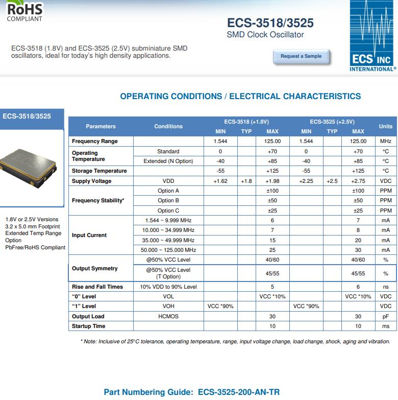 ECS推出廣泛用于羅拉模塊低抖動(dòng)的有源振蕩器ECS-3518-080-B-TR,ECS推出編碼ECS-3518-080-B-TR,1.8V或2.5V版本,3.2 x 5.0 mm占地面積,擴(kuò)展溫度范圍,選項(xiàng),PbFree /通過無鉛認(rèn)證,ECS-3518 (1.8V)和ECS-3525 (2.5V)超小型SMD振蕩器,當(dāng)今高密度應(yīng)用的理想選擇。