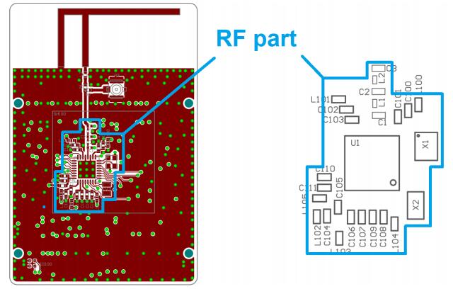 使用EFR32系列2無線MCU的設(shè)計(jì)建議已使用SiliconLabs提供的參考設(shè)計(jì)完成廣泛測試。建議設(shè)計(jì)者按原樣使用參考設(shè)計(jì),因?yàn)槠淠軌虮M可能減小寄生現(xiàn)象導(dǎo)致或不良元件布置和PCB排線產(chǎn)生的失諧作用。EFR32參考設(shè)計(jì)文件位于SimplicityStudio的“套件文檔”選項(xiàng)卡下。設(shè)計(jì)的緊湊型RF部分(不包括50Ω單端天線)以藍(lán)框圈出,強(qiáng)烈建議使用圈出的RF布局,以避免出現(xiàn)任何可能的失諧作用。下圖顯示了設(shè)計(jì)中圈出的緊湊型RF部分。